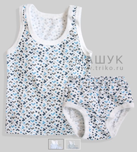 Комплект для мальчика. Классическая майка прямого силуэта. Горловина и пройма майки обработаны бейкой. Низ - швом вподгибку. Трусы - плавки. Пояс трусов распошит швом вподгибку с узкой элатичной тесьмой. Ножки обработаны бейкой.
