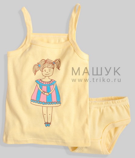 Комплет состоит из майки и трусов. Майка полуприталенного силуэта на узких бретелях. Горловина и пройма обработаны бейкой. Низ изделия распошит швом вподгибку. Майка украшена ярким принтом. Трусы с широким боком. Верх распошит резинкой (вздежкой). Ножки обработаны бейкой.