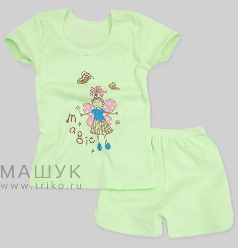Комплект состоит из футболки и шорт. Футболка с красочным принтом. Горловина и пройма обработаны бейкой. Низ обработан швом вподгибку. Шорты: верх изделия обработан швом вподгибку с прокладыванием эластичной тесьмы. Низ обработан швом вподгибку.