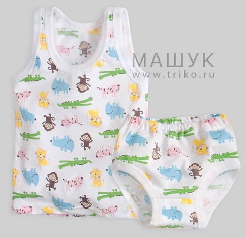 Майка: классическая модель, прямого силуэта, на широких бретелях. Горловина и пройма окантованы бейкой . Низ обработан швом вподгибку. Трусы: верх обработан швом вподгибку с прокладыванием эластичной тесьмы (вздежка). Ножки обработаны бейкой.