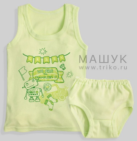 Комплект для мальчика. Классическая майка прямого силуэта. Горловина и пройма майки обработаны бейкой. Низ - швом вподгибку . Майка украшена принтом.Трусы - плавки. Пояс трусов распошит швом вподгибку с узкой элатичной тесьмой. Ножки обработаны бейкой.