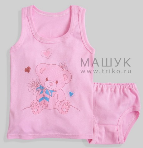 Комплет состоит из майки и трусов. Майка полуприталенного силуэта на широких бретелях. Горловина и пройма обработаны бейкой. Низ изделия распошит швом вподгибку. Майка украшена ярким принтом. Трусы с широким боком. Верх распошит резинкой (вздежкой). Ножки обработаны бейкой.