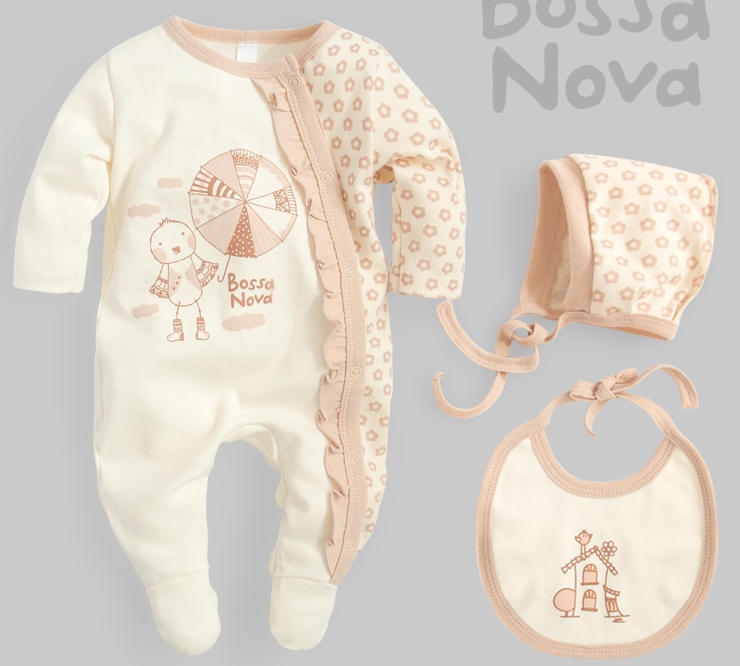 Комплект ясельный для девочки состоит из трех предметов: чепчика, нагрудника и комбинезона. Изделия украшены принтом и оборкой. Использовано однотонное и набивное полотно.