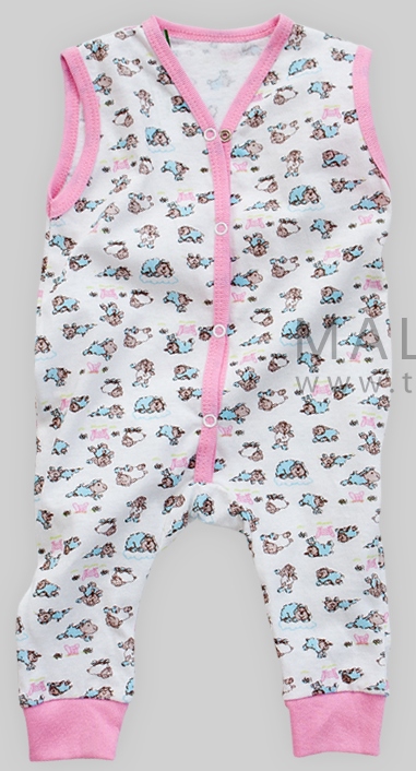 Полукомбенизон без рукавов с манжетами на ножках. Манжеты выполнены из трикотажного эластичного полотна. Впереди застежка на кнопки от горловины до ластовицы. Пройма и горловина обработаны бейкой.