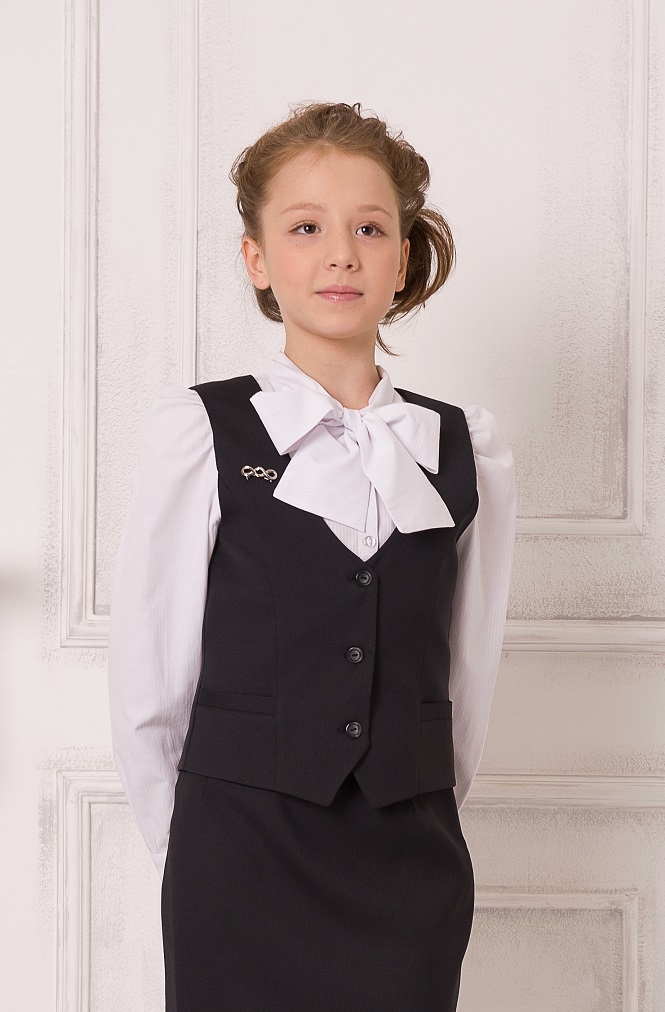 Классический жилет полуприлегающего силуэта, с рельефами и карманами на полочках, на спинке - хлястик.