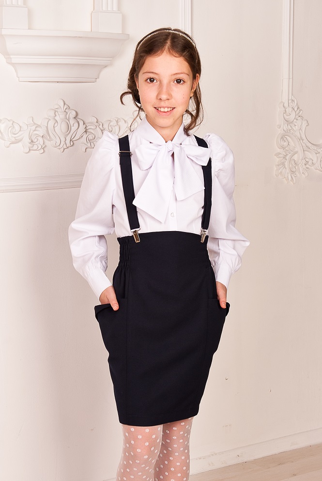 Сарафан с отстегивающимися лямками и большими днкорированными карманами. С завышенной линией талии, зауженный к низу. Сзади - шлица.