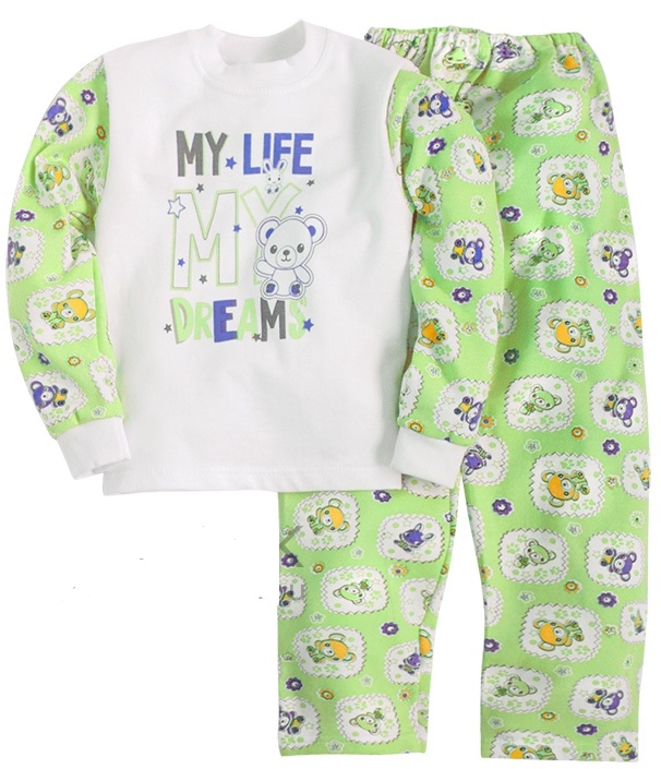 Пижама для мальчика состоит из джемпера и брюк. Джемпер прямого силуэта, комбинированный. Горловина обработана эластичным воротником. Низ джемпера распошит швом вподгибку. Брюки прямого силуэта. Верх брюк обработан швом вподгибку с прокладыванием эластичной тесьмы (вздежка). Джемпер украшен веселым принтом.