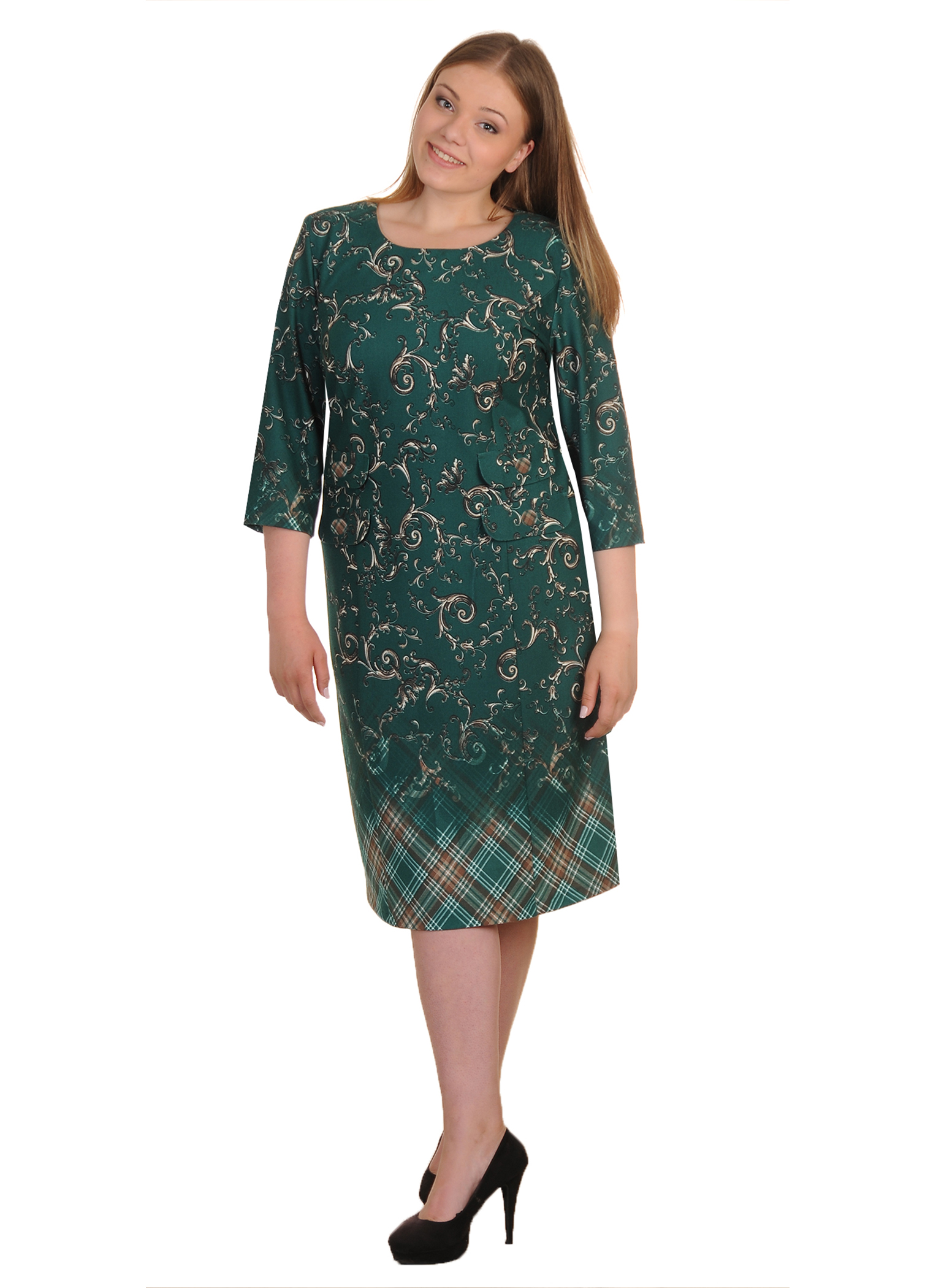 Платье-футляр из плотного <<Джерси>> глубокого изумрудно-зелёного цвета. По низу платья изящный рисунок переходит в клетку. Перед платья украшен 4-мя клапанами с красивыми пуговицами. Рукав 3/4 .