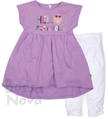 Комплект для девочки из однотонного полотна. Низ туники фигурный, расширенный со сборками от кокетки. Горловина обработана бейкой, рукава цельнокройные. На полочке принт. Лосины эластичный со сборкой по низу.