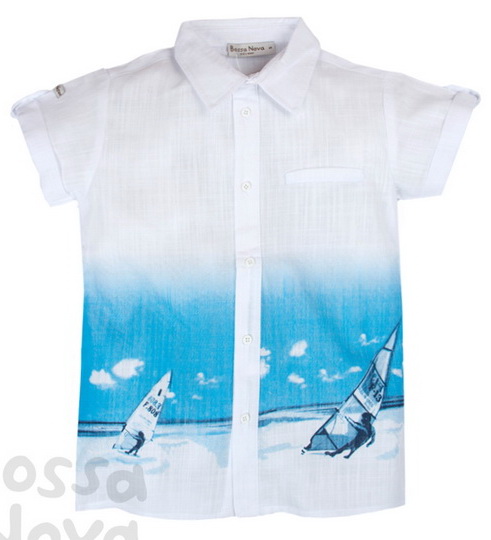 Рубашка для мальчика с коротким рукавом. Застежка центральная на петли и пуговицы. Воротник отложной со стойкой. Рукава с отворотами. По низу рубашки купонный принт.