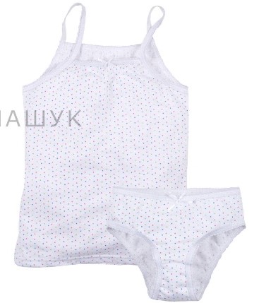 Описание: Комплект для девочки состоит из майки и трусов. Майка прямого силуэта на узких бретелях, низ изделия обработан швом вподгибку. Трусы - модель с узким боком. Верх изделия и ножки обработаны резинкой на сгиб.