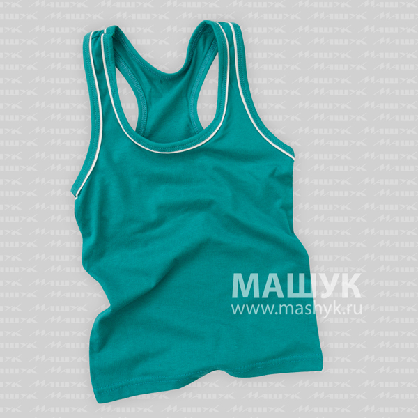 Майка детская; прямого силуэта; на широких бретелях;с углубленным вырезом. Горловина и пройма окантованы бейкой с отделочным кантом.. Низ распошит швом вподгибку.