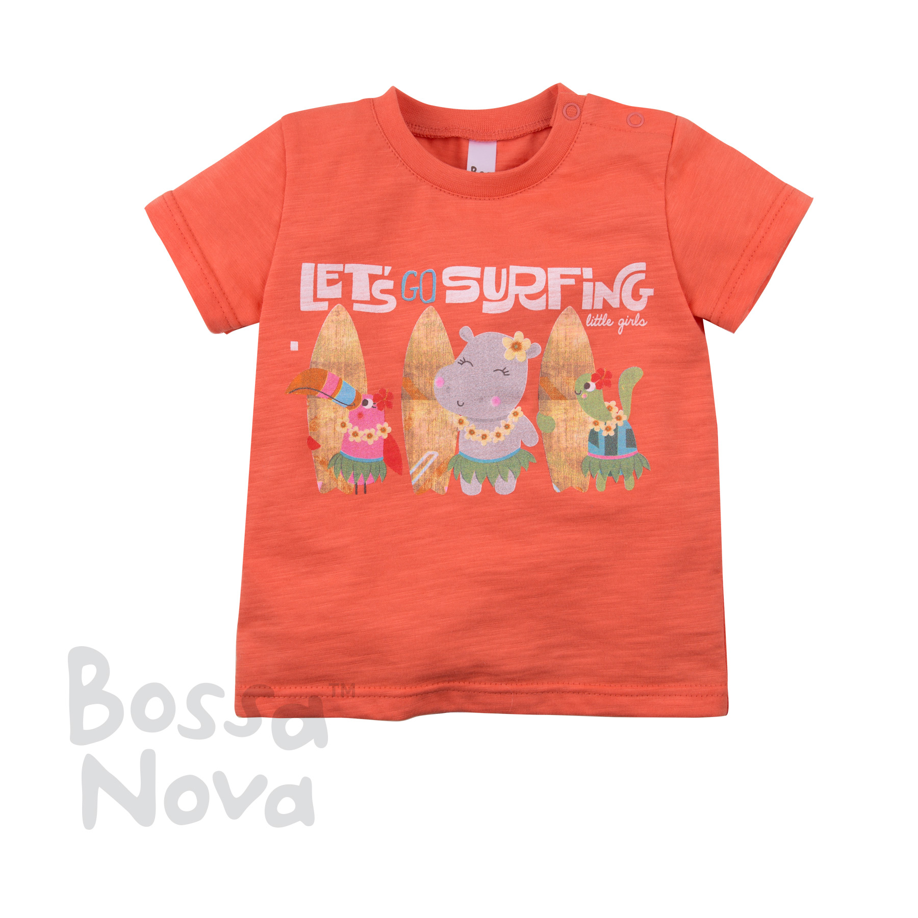Описание: Футболка для девочки с коротким рукавом. Горловина обработана эластичным воротником. Застежка на плече на кнопки.На полочке принт.