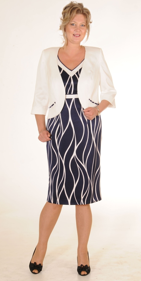 Комплект 2-ка. Платье футляр из нарядной ткани модного дизайна, украшенное отделкой в виде вшитого пояска под грудью и в V – образном вырезе горловины. Короткий рукав придаёт платью лёгкость и изящество. Ансамбль дополнен однотонным пиджаком из ткани соответствующей отделке, застёгивающимся встык на нарядную пуговицу.