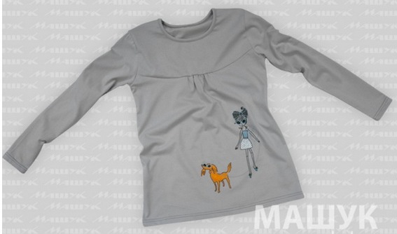 Джемпер для девочек, расширенный к низу, с отрезной кокеткой по линии груди. Горловина обработана узкой бейкой. Низ рукавов и низ изделия распошиты швом в подгибку. Изделие украшено рисунком(накат).