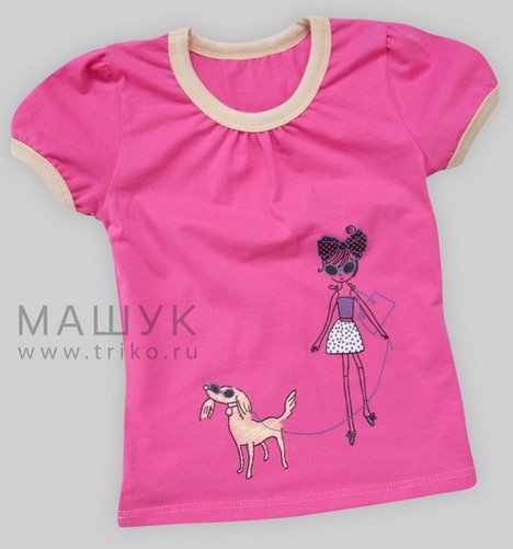Футболка для девочек.Горловина и низ рукавов обработаны цветной бейкой, по горловине декоративная сборка на полочке. Рукав-фонарик. Изделие украшено рисунком(накат).