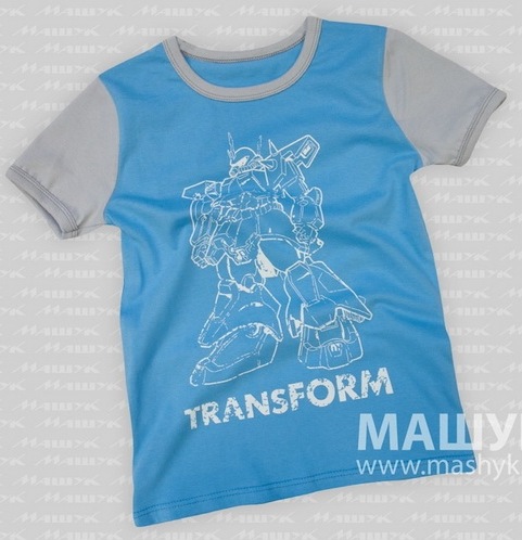 Футболка для мальчиков двухцветная. Рукава и горловина обработаны широкой бейкой в цвет рукавов или изделия. Низ изделия распошит. Изделие украшено рисунком (накат).